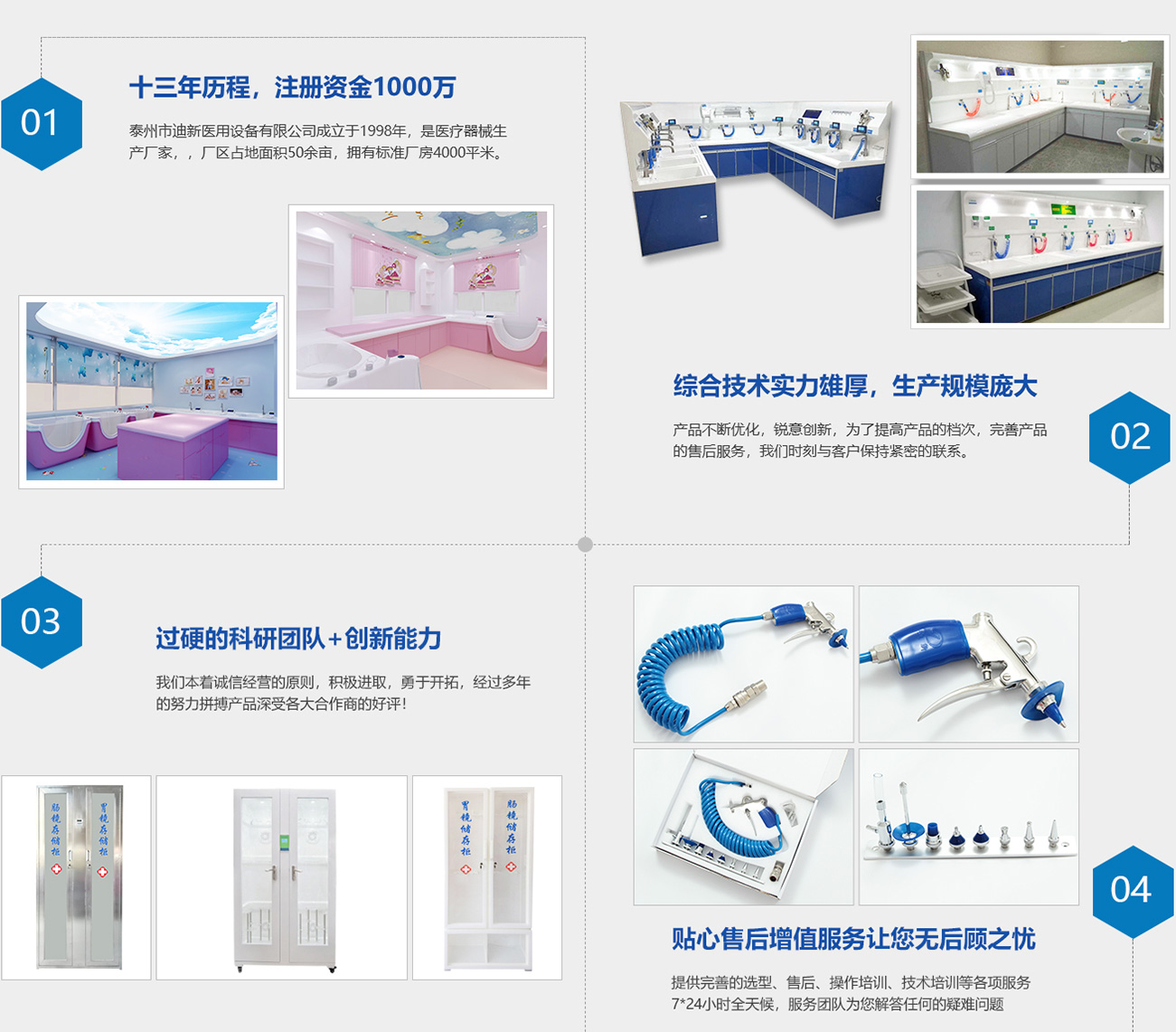 泰州市迪新醫(yī)用設(shè)備有限公司成立于1998年,是醫(yī)療器械生產(chǎn)廠家。公司坐落于江蘇省泰州市新區(qū),廠區(qū)占地面積50余畝,擁有標(biāo)準(zhǔn)廠房4000平米。公司在職各類高中級技術(shù)人員20余名,職工100余名。我公司是以生產(chǎn)內(nèi)窺鏡清洗工作站、內(nèi)鏡清洗槽、內(nèi)窺鏡儲存柜、超聲波清洗器、高壓水槍、電腦吹干機(jī)等為主導(dǎo)產(chǎn)品醫(yī)療器械生產(chǎn)廠家。公司有多年生產(chǎn)設(shè)備的經(jīng)驗(yàn),實(shí)力雄厚,擁有研發(fā)高新產(chǎn)品的能力,完善的加工設(shè)備和齊全的檢測手段。公司生產(chǎn)的內(nèi)窺鏡清洗工作站經(jīng)上海長海醫(yī)院、瑞金醫(yī)院、仁濟(jì)醫(yī)院、浙醫(yī)附院、湖南醫(yī)大附屬湘雅醫(yī)院、江蘇省人民醫(yī)院等一大批內(nèi)窺鏡專家使用后一致認(rèn)可,被推廣應(yīng)用。多年來,企業(yè)不斷開拓創(chuàng)新,競爭拼搏,本著“精心制造、誠心服務(wù)、低價(jià)銷售、重守合同、送貨快捷”的宗旨,贏得了廣大消費(fèi)者的認(rèn)可。誠實(shí)守信、共贏進(jìn)取是每個(gè)迪新人的精神基石,我們熱誠期盼與各企事業(yè)單位合作俱進(jìn),共創(chuàng)輝煌。現(xiàn)我公司誠招各省市地區(qū)代理商。歡迎各家醫(yī)院來電來函洽談!